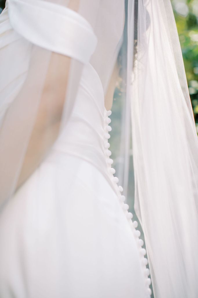 Softly lined in Brisa stretch jersey for effortless comfort, the Cameron gown features a concealed zipper with an inner elastic closure, finished with a trail of covered buttons that cascade elegantly to the hem—a detail synonymous with couture craftsmanship.